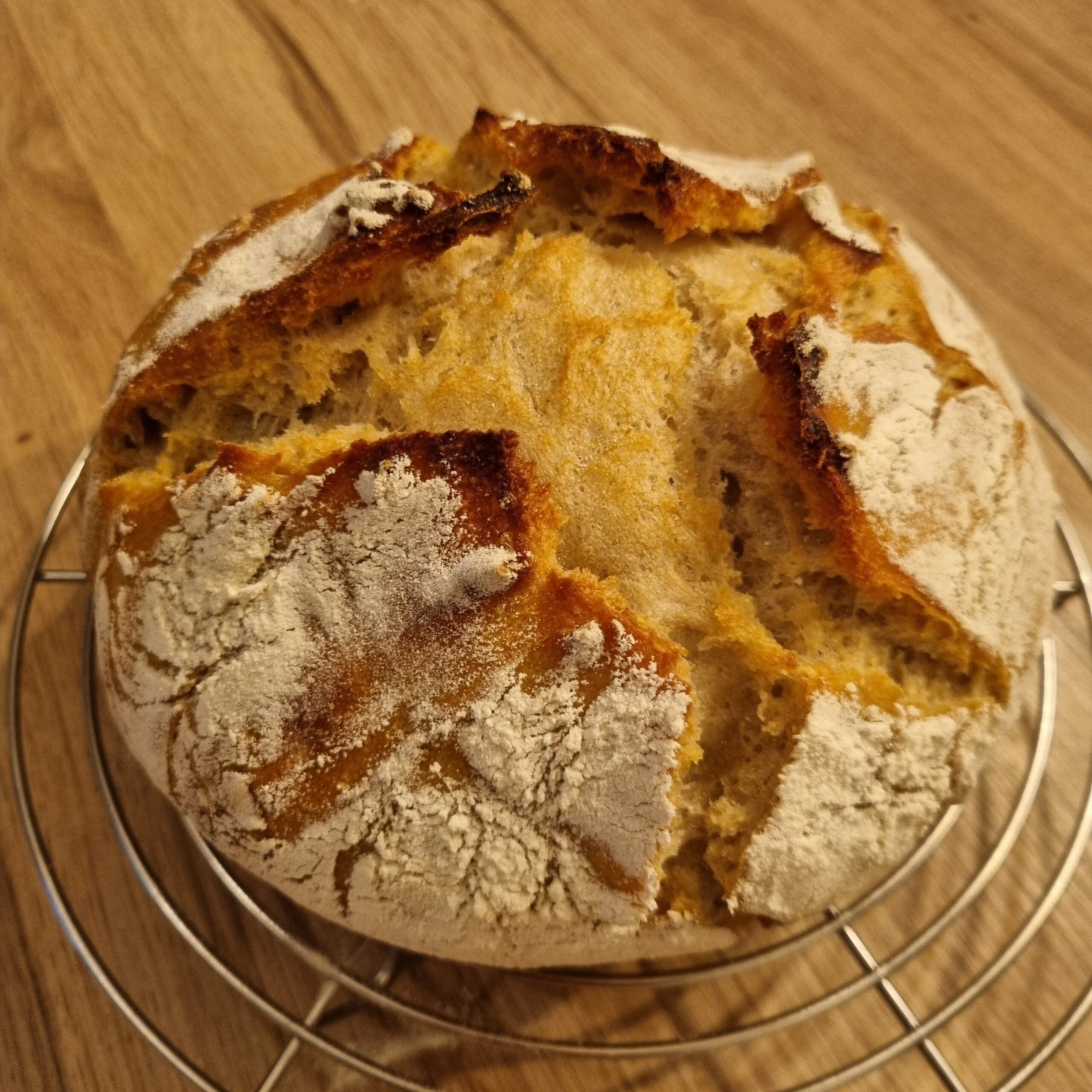 Lorsque la cuisson est terminée je sors le pain de la cocotte et je le pose sur une grille et le recouvre d’un torchon. Il va devoir refroidir plusieurs heures avant d’être mangé.