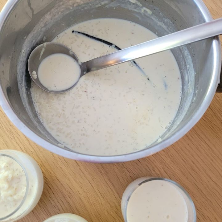 - Etape 2 : Fendez la gousse en 2 au couteau grattez-la et plongez la gousse et ses grains dans le mélange : lait + crème + sucre et porter à ébullition. Puis laissez cuire à petits bouillons durant 35 à 40 minutes. En fin de cuisson, ne vous inquiétez pas, cela peut vous paraître « liquide » mais cela va s’épaissir en refroidissant. Ne prolongez pas plus la cuisson sinon vous risqueriez de l’assécher.