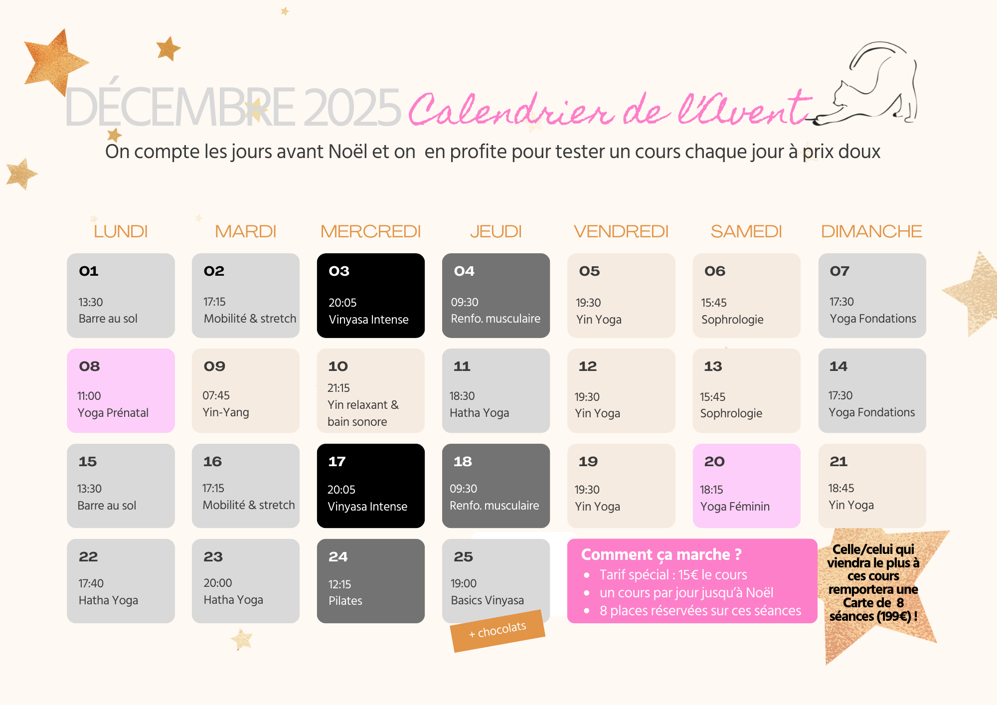 Celle ou celui qui aura participé le plus à des cours du Calendrier de l’Avent se verra offrir une Carte de 8 séances.